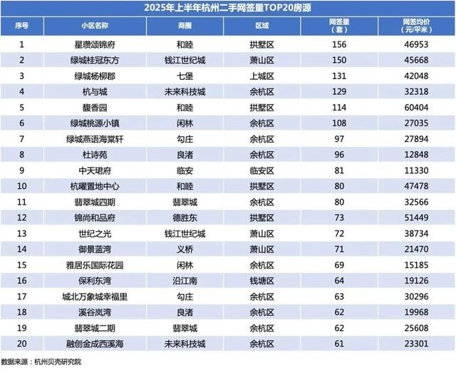 根据杭州贝壳研究院数据,排名前五位的小区分别是: